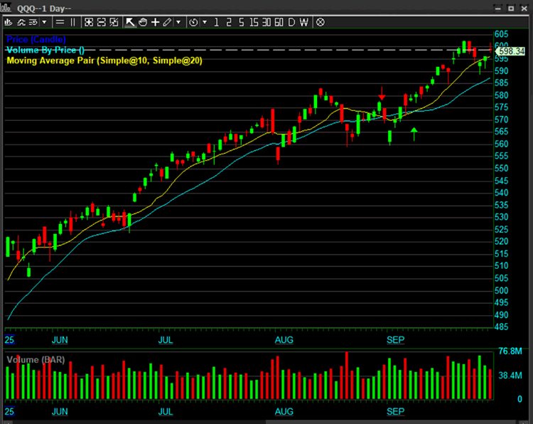 The QQQ, the ETF for the NASDAQ 100 Index looks toppy, with a lower high and Doji Star near all time highs. The question on every traders mind is whether or not these valuations are sustainable.