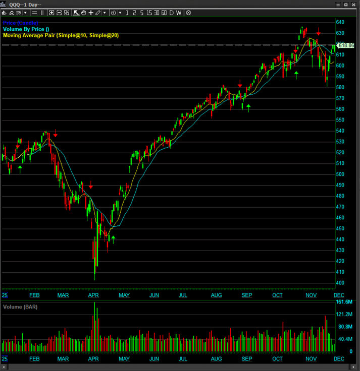 All in all, November has been a roller coaster, marked by a steep decline followed by a sharp rally. This kind of activity may foreshadow what lies ahead: increased volatility after a prolonged and powerful market advance. While it would be healthier for the market to correct and move sideways to digest recent gains, it is more likely that, given all the transitional forces in play, 2026 will involve consolidation or modest downside as the new economic landscape takes shape. In this environment, it may be wise to adopt a more conservative stance and reduce risk rather than expect another year of strong gains.